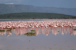 博高利亚湖湖水盐碱度很高,这里蓝藻生产丰富,给火烈鸟提供了充足的食物,吸引了大片的火焰鸟在这里生存和繁殖。全球三分之一的火烈鸟都在这里!